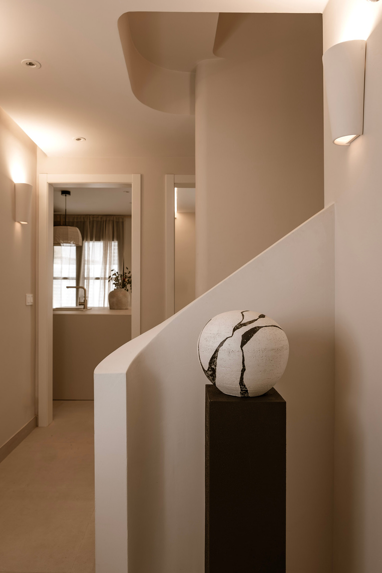 Sus interiores de estética orgánica y natural se articulan en torno a una escalera central, que evoca con sus curvas, el vaivén de las olas.