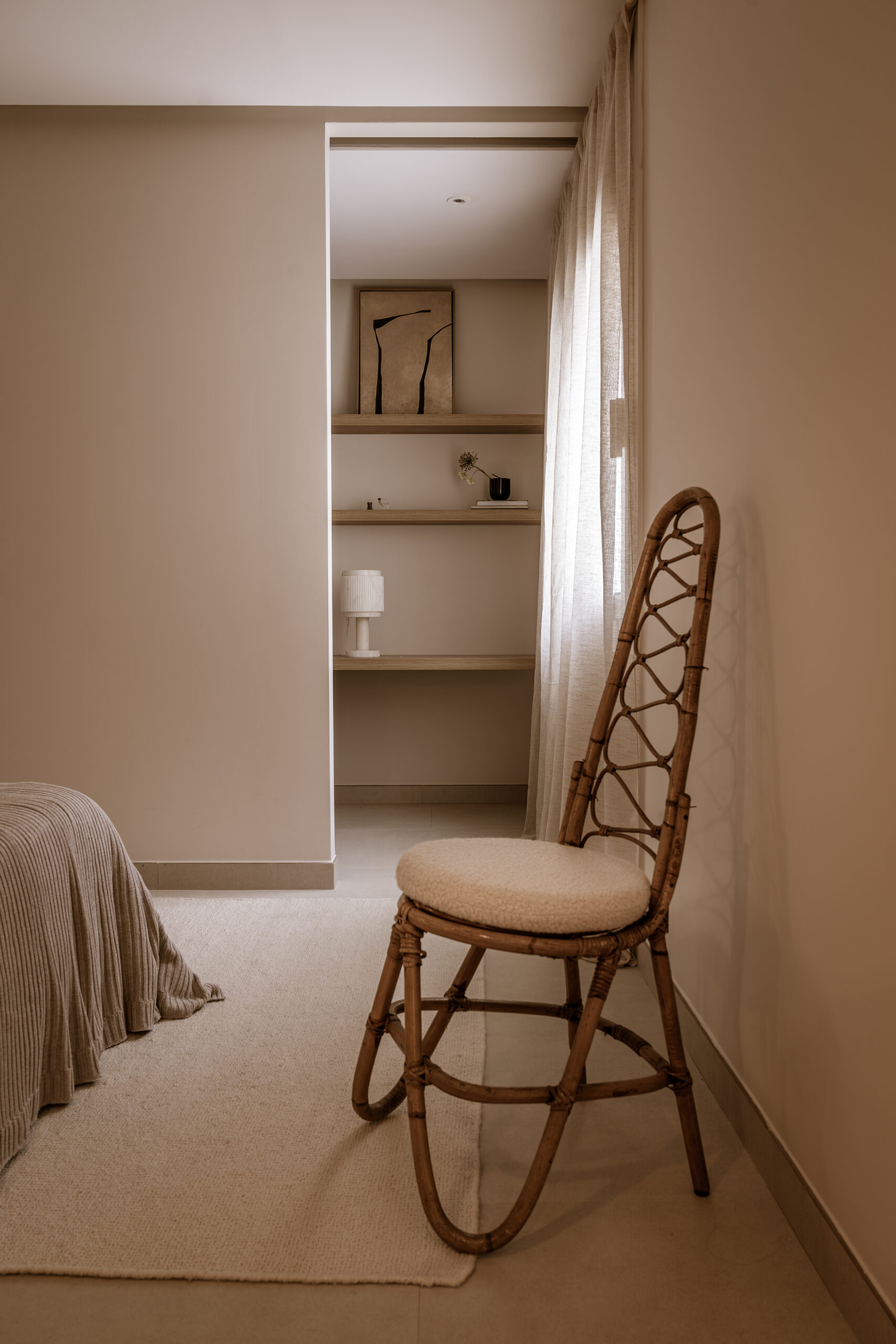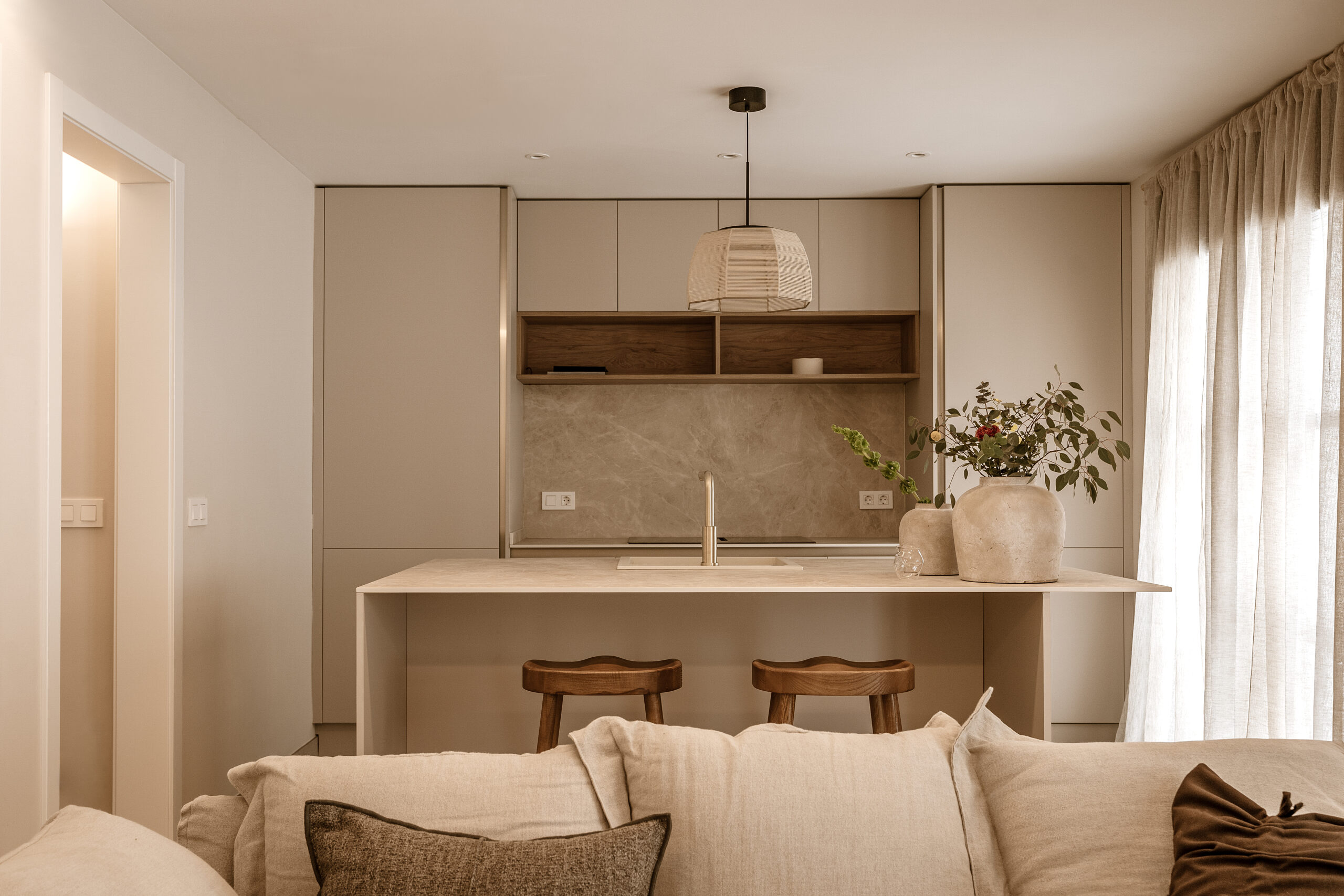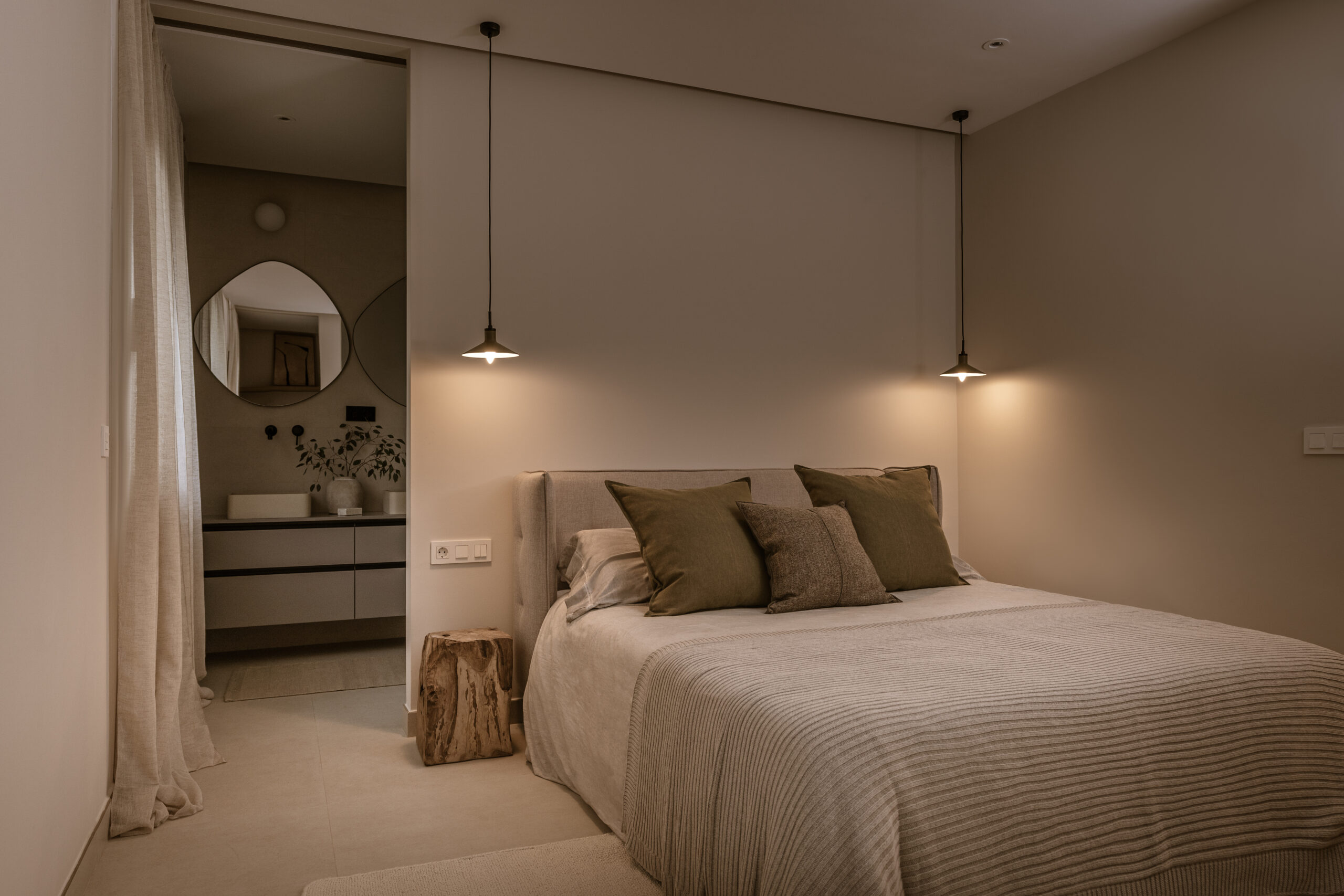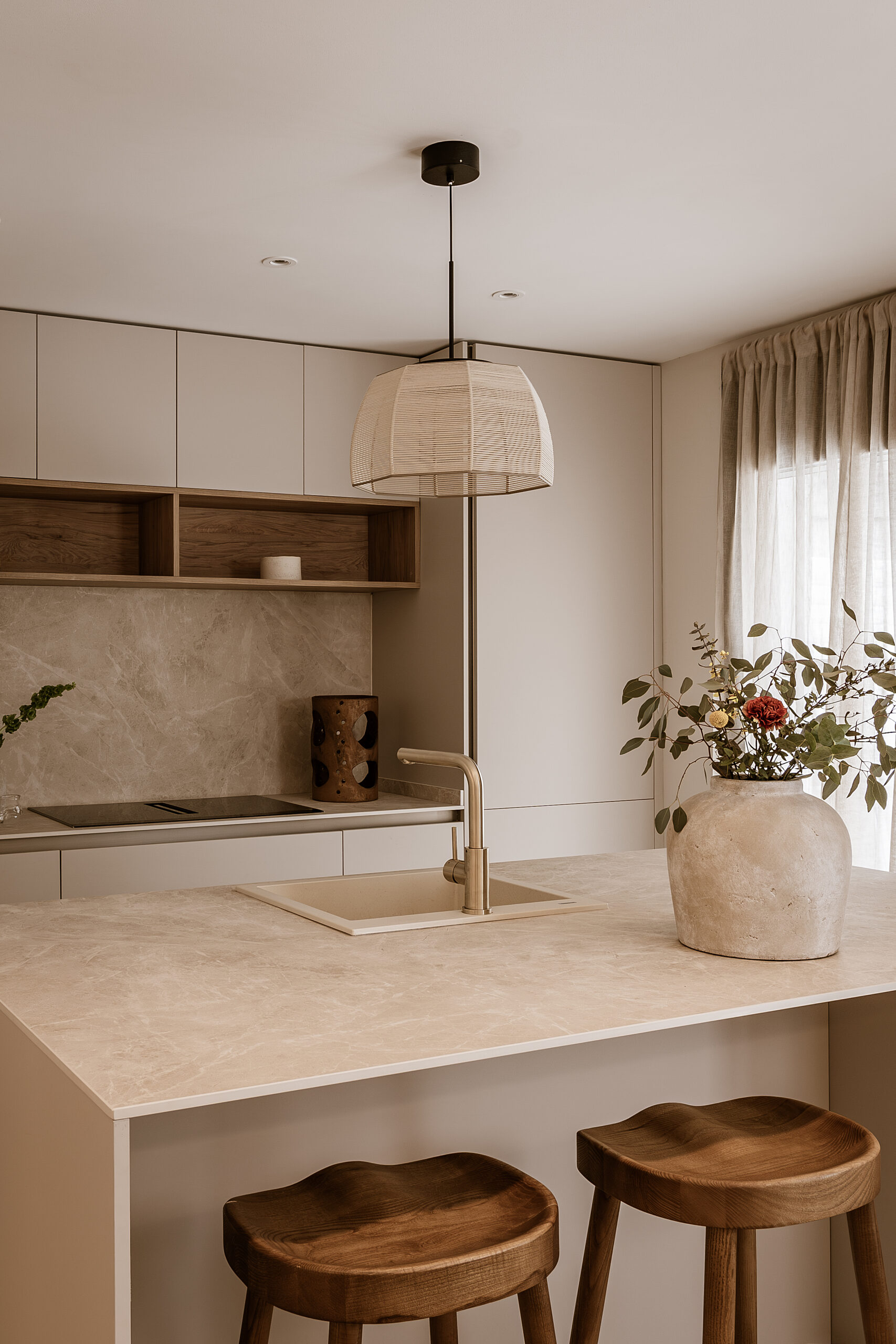Tonos arena, maderas suaves, y textiles honestos crean una atmósfera serena y acogedora, realzada por una iluminación sutil que transforma los espacios a lo largo de un día de verano.