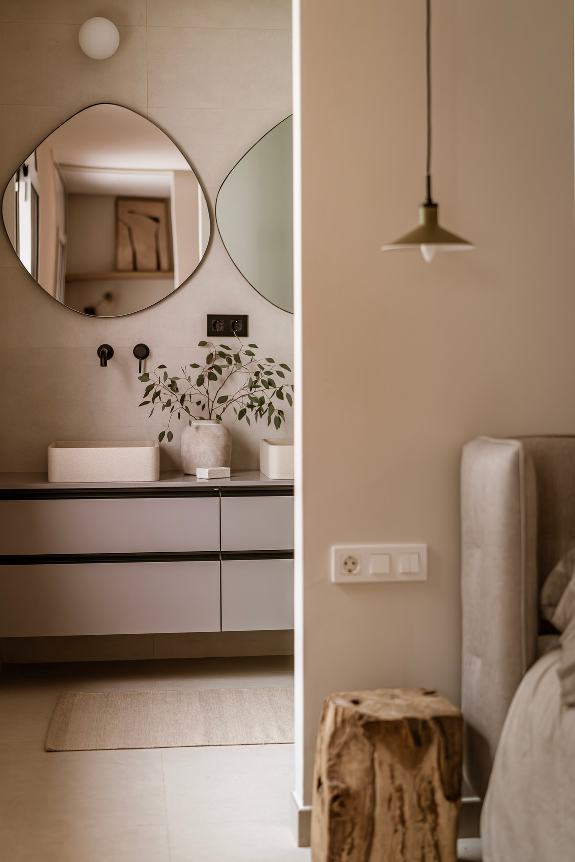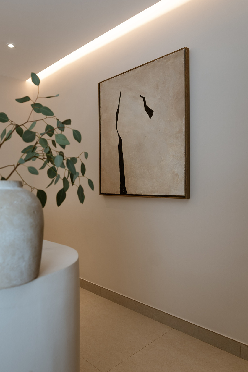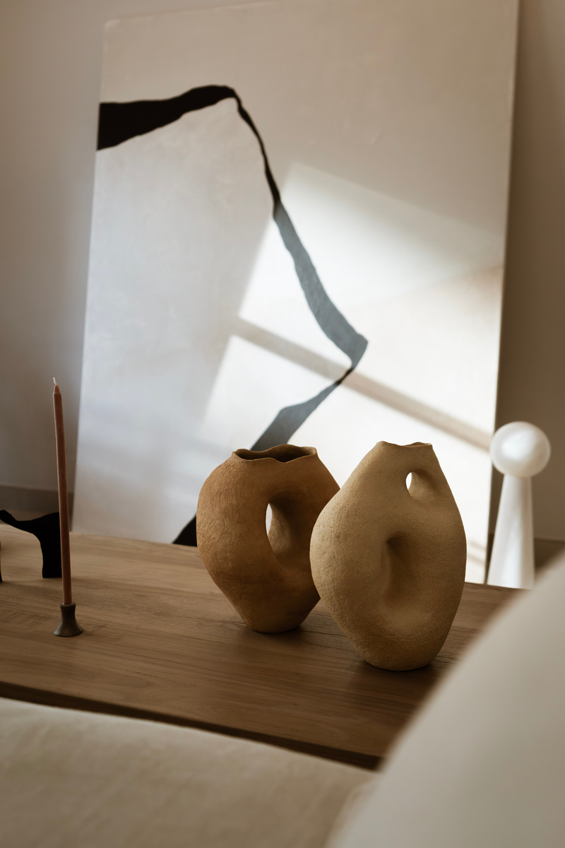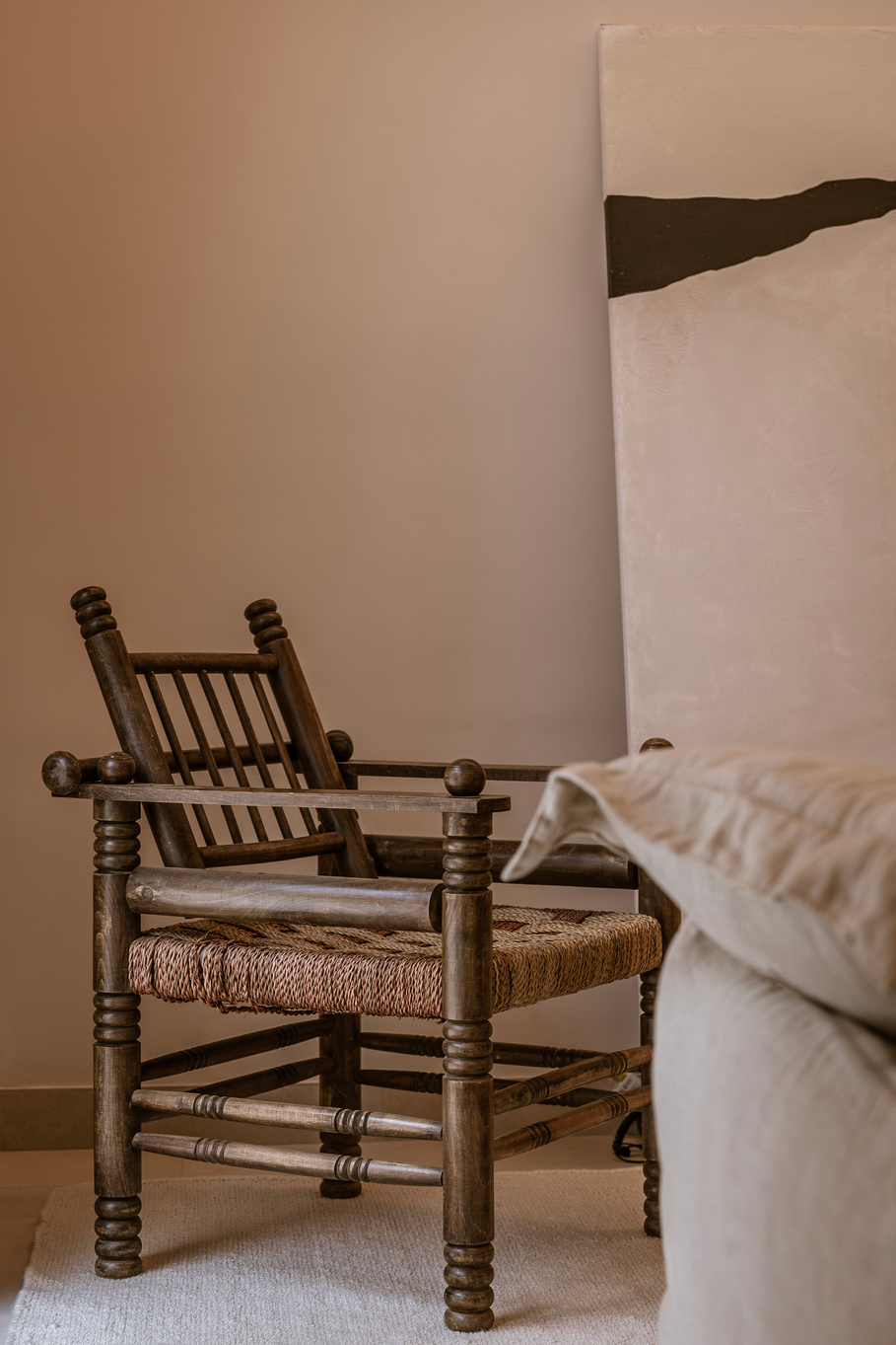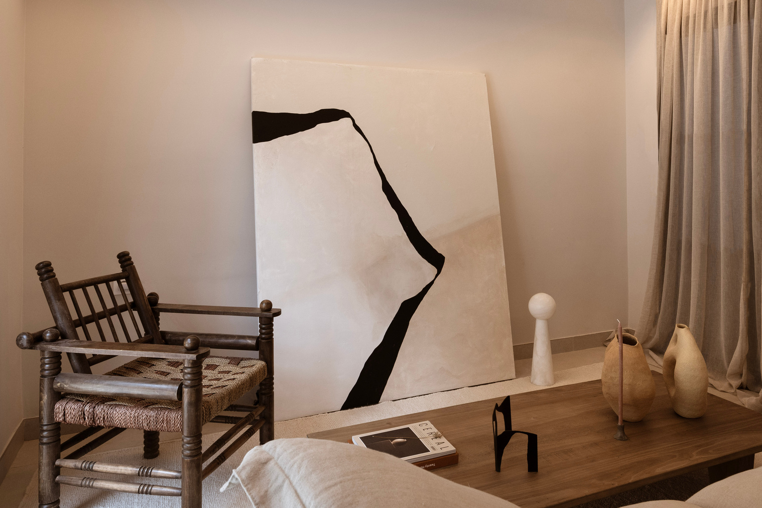 Tonos arena, maderas suaves, y textiles honestos crean una atmósfera serena y acogedora, realzada por una iluminación sutil que transforma los espacios a lo largo de un día de verano.