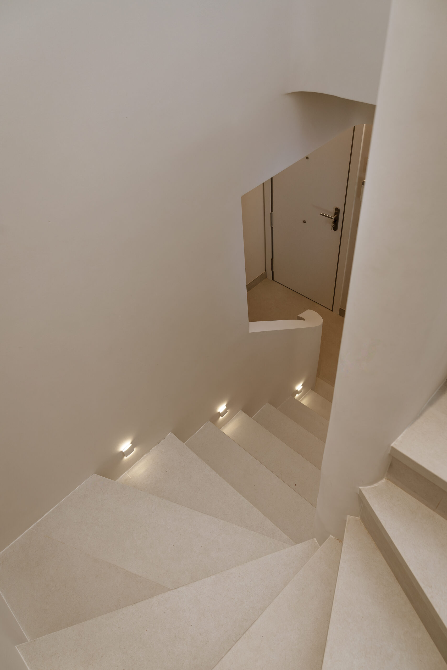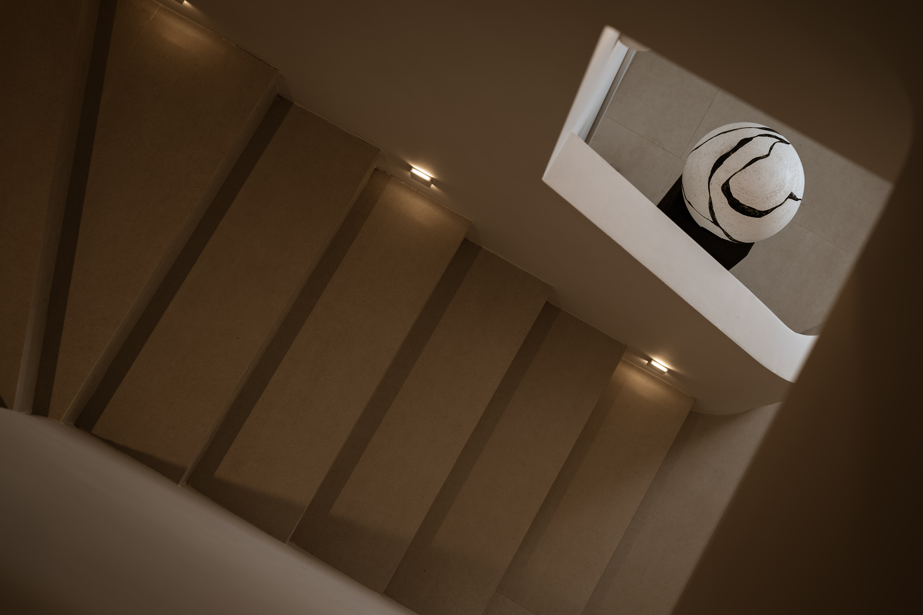 Sus interiores de estética orgánica y natural se articulan en torno a una escalera central, que evoca con sus curvas, el vaivén de las olas.
